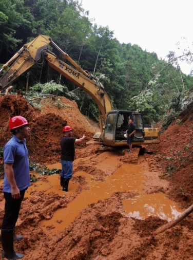 隨后,市政集團搶險救援突擊隊接到了搶修澄邦村村道的任務,短短5公里3米寬的村道,每幾十米就有一個坍塌,大型的拖車無法將挖掘機運送至村里進行搶險救災。經(jīng)過突擊隊現(xiàn)場研究,制定了采用小型挖掘機一邊先行搶修道路一邊往澄邦村前行的方案,最后挖掘機用了5小時到達村里開始搶險工作。