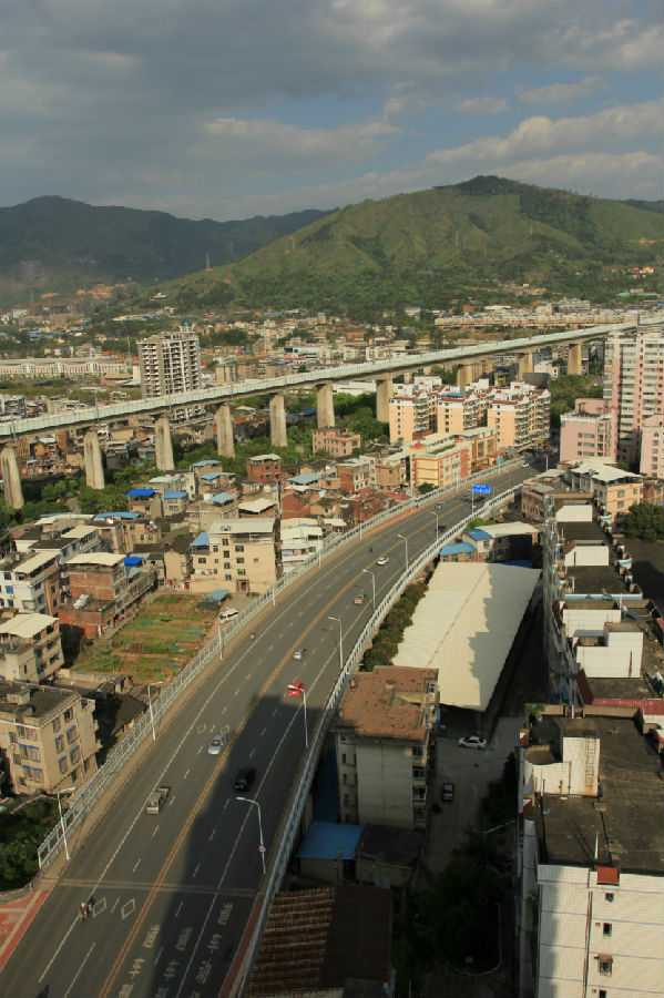 龍巖市東興高架橋位于龍巖市中心城區(qū)東北部,總投資9926萬元, 城市主干道Ⅱ級,為東興路東風橋至南環(huán)路段,該路段長約740米,屬城市內(nèi)環(huán)線,車流量大,沿線與登高東路、鐵路、棋盤路及南環(huán)路相交,與鐵路平交處該路段高架橋上跨鐵路;在登高東路與東興路高架橋之間設(shè)置A、B、C、D匝道(均為單向單車道)利用4條匝道將既有登高東路與東興路相連,從而在東興路與登高路之間形成半苜蓿葉型互通式立交。高架橋全長461.77米,沿線與登高東路、漳龍鐵路、棋盤路及支小路相交,本工程采用高架上跨形式,跨越相交道路與鐵路,完全解決了與鐵路平交的安全隱患。橋梁上部結(jié)構(gòu)采用(18.5+20+20)m普通鋼筋砼連續(xù)梁及25m、30m預應(yīng)力砼空心板梁,橋面連續(xù),下部采用樁接立柱接蓋梁橋墩與U型橋臺,墩臺基礎(chǔ)采用鉆孔灌注樁基礎(chǔ)。