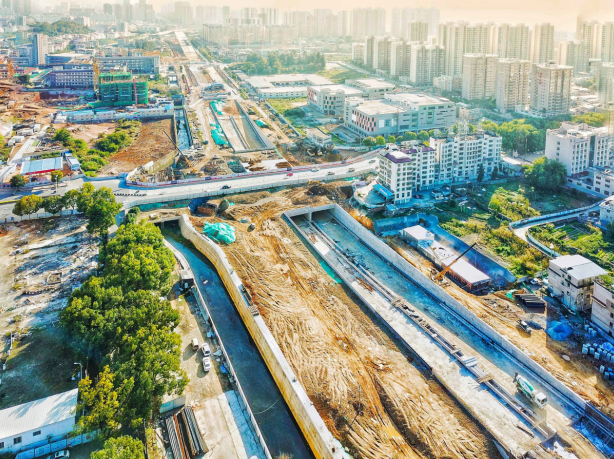 2017年9月開工。目前,下穿車型通道U型槽、箱型通道、排洪溝主體已完成,管廊主體結(jié)構(gòu)已完成45米。
