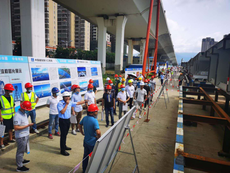 2020年6月28日,由龍巖城市發(fā)展集團(tuán)有限公司主辦,龍巖市政建設(shè)集團(tuán)有限公司(市城投公司)承辦,北京鐵研建設(shè)監(jiān)理有限公司、中國建筑第六工程局有限公司、中冶(上海)鋼結(jié)構(gòu)科技有限公司協(xié)辦的龍巖大道高架橋項(xiàng)目質(zhì)量安全標(biāo)準(zhǔn)化觀摩會在龍巖大道高架橋主橋鋼箱梁工程現(xiàn)場舉行。觀摩會分拼裝區(qū)域、提升站區(qū)域、頂推滑移區(qū)域、步履滑移區(qū)域及主橋轉(zhuǎn)體區(qū)域分別展示了龍巖大橋主橋鋼結(jié)構(gòu)拼裝、提升、弧形頂推滑移、步履滑移等新工藝及主塔“水平二次轉(zhuǎn)體”鋼箱梁頂推、斜拉索施工技術(shù)