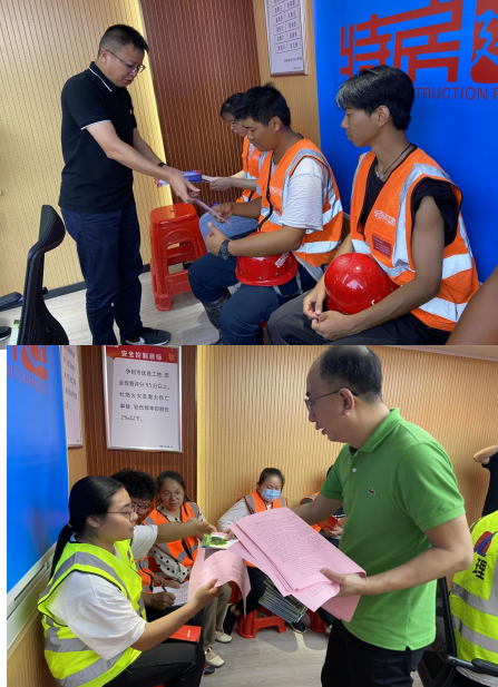 會后,黨支部書記、副董事長、總經(jīng)理孔華修海金副總經(jīng)理分別向項目部人員及工人現(xiàn)場分發(fā)安全生產(chǎn)月宣傳單及“五進”等宣傳資料。